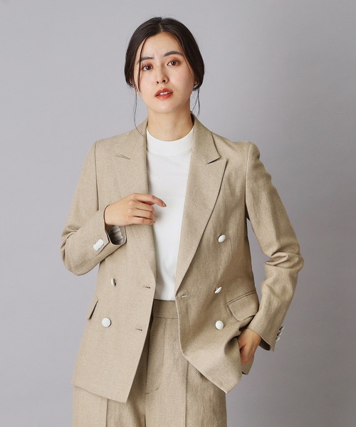 【毎年大好評のリネン混ジャケット★遊び心をプラスした大人のマリンスタイル】 ●ややコンパクトなシルエットとピークドラペルデザインがマニッシュで知的な印象。 ●メタル釦に塗装加工を施した遊び心あるディティールが目を惹く。 ●今期は袖にキュプラストライプ裏地を使用。袖口を折り返した際のアクセントに。 ●こだわり マニッシュな印象にこだわり衿はピークドラペルデザインに。 ボディは着易さにこだわりながらコンパクトなシルエットに仕立てています。 釦は別注でメタル素材にカラーの塗装を施したこだわりのディティール。 ストレッチ性のある素材なのでラフな着心地です。 身頃は薄手のコットン素材を半裏仕立てにしており、涼やかに着られます。 袖は袖口を折り返す事が多い季節に嬉しいストライプ柄を使用。 ※オフのみ無地の裏を使用。 ●素材 春夏らしく麻を高混率にして清涼感とドライタッチを追求した涼やかなリネン混のツイル素材を使用。 横にストレッチ糸を入れる事で、生地が引き締まり仕立て映えのする仕上がりに。 リネンらしいミックス感のある表面感と色合いも魅力。 ※同素材でワイドパンツ(085-65005)の展開もあります。 単品着用も◎デニム等と合わせてもお洒落。 ※照明の関係により、実際よりも色味が違って見える場合があります。また、パソコン・スマートフォンなどの環境により、若干製品と画像のカラーが異なる場合もございます。 店舗へのお問い合わせ商品番号:085-45002 ●製品寸法: 34(SS):着丈62cm B89cm 袖丈58cm 肩幅37cm 36(S):着丈64cm B92cm 袖丈59cm 肩幅38cm 38(M):着丈65cm B95cm 袖丈60cm 肩幅39cm 備考:重量:約490g(サンプルサイズ)