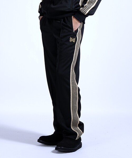 ”ニードルズからシーズン通して定番的にリリースされるTRACK PANT - LAME TAPE”素材やカラーリングをマイナーチェンジしながら、毎シーズン展開されるトラックパンツ。落ち着いた光沢感がありアクティブな動きに対応するジャージー素材を使用。太いラインで強調されきらりと輝くラメのストライプテープがありそうでない独特の世界観が垣間見える一品です。セットアップでの着用はもちろん、様々なアイテムと組み合わせ、遊びがきいた着こなしにもおすすめです。