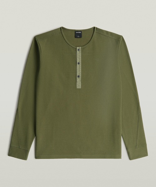 ベーシックを、再構築。DESIGN|クラシックを再解釈した、端正なカジュアルStructured Tweeter Grandad T-Shirtは、伝統的なグランダッドカラー(ヘンリーネック)に、現代的な構築感を掛け合わせたロングスリーブTシャツ。Tシャツの気軽さと、シャツのようなきちんと感を併せ持つデザインが、スタイリングの幅を広げます。程よく身体に沿うレギュラーフィットに、バランスの取りやすいレギュラーレングス。フロントのボタン留めが縦のラインを強調し、シンプルな中にさりげない表情をプラスします。控えめなグラフィックディテールが、G-Star RAWらしい個性を添え、1枚着でも成立する仕上がりです。FABRIC|しっかり感と伸びやかさを両立素材には、64% リサイクルポリエステル / 34% オーガニックコットン / 2% エラスタンを採用。環境に配慮しながらも、形崩れしにくいしっかりとした厚みと、快適なストレッチ性を実現しています。滑らかでハリのある生地感は、カジュアルすぎず、レイヤードスタイルにも最適。長時間の着用でもストレスを感じにくく、デイリーに頼れる一枚です。STYLING|一枚でも、インナーでも活躍・デニムやチノと合わせて、クリーンな大人カジュアルに。・オーバーシャツやジャケットのインナーとして、首元のデザインをアクセントに。・秋冬はレイヤード、春は一枚着でシーズンレスに活躍。BRAND STORYG-STARについて固定観念の破壊を掲げ、解剖学的な視点を取り入れたデザインのコレクションを展開するアムステルダムのストリートブランド。1989年に誕生して以降、バイカージーンズ「ELWOOD」が象徴するアヴァンギャルドなジーンズや、ワーク・ミリタリーのヴィンテージを現代的に洗練したウェアで構成するコレクションがアンダーグラウンドなストリートピープルの認知を獲得し、ヨーロッパを中心に確固たるポジションを確立しました。創造性とクラフトマンシップに敬意を払い、エレガントでありながらも反逆的なスタンスが生み出すプロダクトが、世界のセレブリティやアーティストをはじめとした独自のスタイルを持つ人々に愛されています。《お気に入り登録》でお得な情報をゲット。・「商品のお気に入り登録」で再入荷通知や、ラスト通知、セール通知も受け取ることができます。・「ブランドのお気に入り登録」で新商品や再入荷など、お得な情報を受け取ることができます。※照明の関係により、実際よりも色味が異なって見える場合があります。またパソコン・スマートフォンなどの環境により、若干商品と画像の色味が異なる場合もございます。予めご了承ください。
