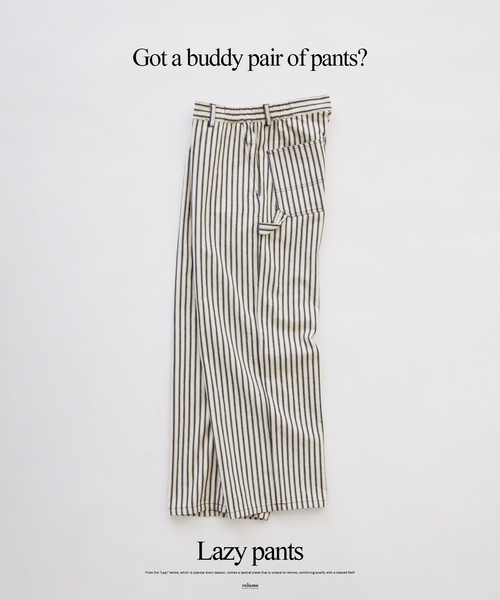 DENIM&HICKORY LAZY PTシリーズ累計販売数を伸ばし続ける、relumeの名品ペインターパンツ。ただ履くだけでサマになるシルエットと、病みつきになるイージーな穿き心地。「ペインターパンツは硬くて重い」というイメージを払拭し、大人の休日着として圧倒的な支持を得ている一本です。■ベルトレスで穿ける「イージー仕様」「レイジーシリーズ」のこだわりは、とことん楽なウエスト周りのディテール。・脇ゴム入り: ウエストの両サイドにゴムを入れることで、窮屈感を解消し、動きに合わせてフィット。・スピンドル付き: 内側にドローコード(紐)を装備しているため、ベルトなしでもズレ落ちず、サイズ調整も自由自在。毎日穿きたくなる快適さを追求しました。■ちょうど良い厚みの「ライトオンスデニム」生地には、通年使える絶妙な厚みのデニム&ヒッコリーを採用。本格的なワークパンツの重厚感を取り除き、最初から肌に馴染む柔らかさと軽やかさを実現しました。夏場でも快適に着用でき、冬場はインナーで調整可能な「一年中穿ける」万能素材です。■計算された「ワイドシルエット」ズドンと落ちる迫力のあるワイドシルエットながら、野暮ったく見えない絶妙なバランス。お尻周りや太ももにたっぷりとゆとりを持たせているため、体型を気にせずリラックスして着用いただけます。Tシャツ一枚と合わせるだけで「頑張りすぎない、大人のこなれたアメカジ」が完成します。■魅力的な「カラー展開」ナチュラル(ヒッコリー): クリーンな白ベースのストライプ。春夏のスタイリングに爽やかさをプラスする、主役級の一本。ネイビーB(ヒッコリー): 落ち着いたトーンのネイビーベース。汚れも目立ちにくく、ワークテイストながらシックで引き締まった印象に。ブルー(デニム): ワークスタイルの王道。程よいフェード感(色落ち)があり、届いたその日から古着のような雰囲気を楽しめます。ベージュA: 一般的なベージュよりも深みのある、ブラウンやテラコッタに近い渋いワークカラー。「穿きやすすぎて、色違いでリピート買いした」というお声も多数いただく、relumeのニュースタンダードです。**********************透け感:なし伸縮性:なし光沢感:なし厚さ:普通**********************【スタッフ着用コメント】《スタッフA》身長:177cm/体重:67kg/普段サイズ:L/着用サイズ:Lサイズ感:ゆったりしたワイドでも、だらしなく見えないシルエット。素材感:程よいオンス(厚さ)のデニムで履きやすい。着心地:ウエスト裏にはスピンドル付きで、リラックス感ある履き心地。**********************《画像についてのご注意》※照明の関係により、実際よりも色味が違って見える場合があります。またパソコン・スマートフォンなどの環境により、若干製品と画像のカラーが異なる場合もございます。※商品の色味は、商品アップ画像をご参照ください。《商品のお気に入り登録について》「カートに入れる」または「予約する」右側のハートマークを押していただくと、再入荷、残り1点、セールなどの通知を受け取ることが出来ます。本体:洗濯機洗い(弱)