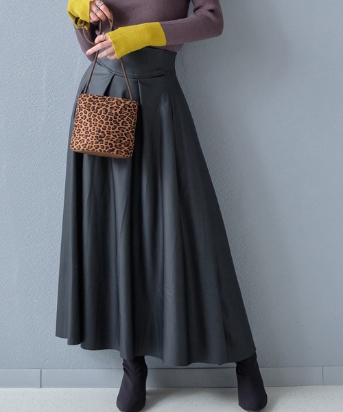 ボックスプリーツの立体的なシルエットが目を惹くフェイクレザーロングスカート。フェイクレザーの素材感が、シンプルながらもスタイリングにエッジを加えてくれる一着です。ハイウエストデザインでトップスをインしてももたつかずスタイルアップできます。縦のラインを強調するロングシルエットが大人っぽく女性らしさ◎バックウエスト部分にファスナー付きで着脱も簡単です。