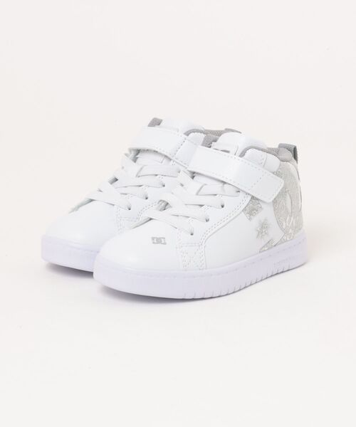 DCの定番モデルCOURT GRAFFIK LITE(コートグラフィック ライト)のハイカットモデルが登場!クリーンな合成皮革アッパーとアイキャッチーなロゴデザインで、スタイリッシュに仕上げたキッズシューズです。ホワイトのアッパーに、モノトーンでペイズリー柄を落とし込んだロゴが映える遊び心のあるデザイン♪クッション性に優れた軽量なEVAアウトソールが、足への衝撃を吸収。ボリュームのある見た目に反するとてもライトな設計で、快適なフットワークを提供します。また柔らかなフォームパッド入りのタンと履き口が、お子さまの足をしっかりとホールド。履き口は、ストラップとゴムシューレースを採用し、脱ぎ履きも簡単に行えます♪さらに内部にインナーゴムを使用することで、シュータンのズレを防ぎ、サポート性も向上。大人モデルをそのまま小さくしたようなデザインと、負担の少ない軽やかな履き心地で、お子さまの足元をオシャレに引き立てます。JAPAN LIMITED・素材:合成皮革・アウトソール:ゴム底・重量(片足):約190g(21.0cm)
