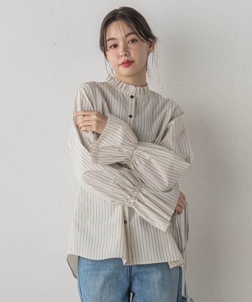 甘すぎず品よく決まる、衿フリルブラウス。フリルカラーとキャンディスリーブの立体感が、女性らしいムードを引き寄せます。衿端と袖口には繊細なピコ刺繍をあしらい、近くで見ても可愛いディテールに。フロントボタンで着脱しやすく、1枚ではもちろん、ニットやカーディガンとのレイヤードでフリルを覗かせる着こなしもおすすめ。ホワイト・ブルーはさらりと軽やかな風合い、アイボリーは綿100%のやわらかい肌触りで、それぞれ違った表情を楽しめます。----------------------------------------------------------------洗濯方法家庭洗濯:液温は40℃を限度とし、洗濯機で弱い洗濯ができる。自然乾燥:日蔭の吊り干しがよい。アイロン:底面温度160℃を限度としてアイロン仕上げができる。ドライクリーニング:石油系溶剤による弱いドライクリーニングができる。----------------------------------------------------------------※画像の商品はサンプルとなりますので実際の商品と仕様、加工、サイズが若干異なる場合がございます。※お客様のモニター環境により実際のお色と多少異なる場合がございます。※撮影状況や光の当たり具合により、色合いが異なって見える場合がございます。※商品タグに記載されたサイズはヌードサイズです。実際の商品のサイズは商品情報の実寸をご確認ください。--------------------------------------------------------------------▼商品のお気に入り登録ハートマークをクリックし、お好きなカラーを選んでお気に入りに登録完売カラーの再入荷通知や、ラスト1点の通知、セールの通知も受け取ることができます。▼ブランドのお気に入り登録新商品や再入荷等、いち早くブランドのお得な情報を受け取ることができます。 --------------------------------------------------------------------