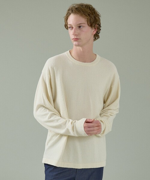 見た目も着心地も柔らかなプルオーバー【素材】ナイロンカバリングを施したコットンブークレー糸を使用。キメの細かいループ状の糸を使用し、もこもことした柔らかなタッチ。ダレにくくデイリーに使いやすい素材感です。【デザイン】リラックス感のある丸みのあるフォルム。袖はややたるみが生まれ、袖口でた溜まりが生まれるよう設計。一枚で着用した時にも、こなれた雰囲気が漂います。前身と後身で差寸を付けたスリット仕様で、レイヤードスタイルも楽しめます。【コーディネート】表面感のある素材を活かすなら、ボトムスはあえてミニマルに。デニムやスラックス、チノパンなど、幅広いアイテムと好相性で、都会的なキレイめカジュアルを演出します。