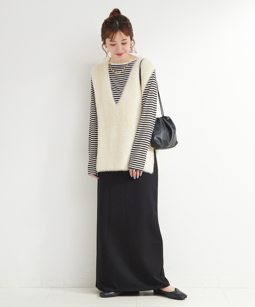 ふわっとフェミニンなベスト×スカートの女性らしさのあるセットアイテム。※こちらは《品番:24040700809040、24040700809140、25060700600030、25060700600130》の追加商品です。・同一商品でも個体差が生じるため、採寸内容に若干の差が生じる場合がございます。ニットは柔らかくて肌触りのよいショートシャギーを使用したVネックのプルオーバータイプでレイヤードしやすいシルエットです。スカートはもちもちとストレッチ性あるダンボール素材を使用したIラインシルエットで、それぞれ単品使いもできて着回しが楽しくなるアイテムになっています。手洗い可能でご自宅でのイージーケアができるのも嬉しいポイントです!**********************透け感:なし裏地:スカートのみ裏地あり伸縮性:ニット/スカートともにあり光沢感:なし生地の厚さ:ニットは普通、スカートはやや薄手~普通**********************【スタッフ着用コメント】《スタッフ staff.K》身長:162cm/普段サイズ:S-M/着用サイズ:フリーサイズ感:ニットはヒップが隠れる丈感、スカートは足首くらいの丈感。素材感:伸縮性があり落ち感のあるニット、もちっと柔らかいダンボール素材のスカートです。着心地:それぞれ伸縮性があり、ストレスフリーな着心地でお洒落見えするセットアップアイテムです。※あくまで個人の感想です。**********************※取り扱いについては、商品についている品質表示でご確認ください。<ベストについて>・毛足が長いため、毛羽の乱れや他のものに毛羽が付着することがあります。・自重伸び(型崩れ)することがあるので、保管の際はハンガーは使用せず、たたんで保管をしてください。・デリケートな製品のため、キズや破れの生じることがあります。 バッグやベルト、表面にざらつきのあるものなどとのスレや引っ掛けにご注意ください。<スカートについて>・着用中の摩擦や、汗、水濡れにご注意ください。濡れたままの状態で擦れると、色移りすることがあります。※こちらの商品は、B.C STOCKでの取り扱いになります。 直接店舗へお問い合わせの際はB.C STOCK店舗へお願い致します。※照明の関係により、実際よりも色味が違って見える場合があります。またパソコン・スマートフォンなどの環境により、若干製品と画像のカラーが異なる場合もございます。※商品の色味は、商品アップ画像をご参照ください。ナチュラル、ネイビー着用スタッフ:163cm 着用サイズ:フリーブラウン着用スタッフ:157cm 着用サイズ:フリー詳細着用モデル:162cm 着用サイズ:フリーベスト:手洗い可能, スカート:手洗い可能