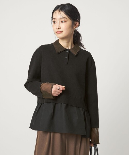 異素材ドッキングでこなれ感のあるプルオーバー■デザイントレンドのポロ襟をレイヤードしたようなデザインが魅力の、異素材切り替えトップス。ふわっと広がる裾デザインがフェミニンな印象です。袖口はシアー素材で、さりげない抜け感を演出しました。着るだけでスタイリングが完成する、主役級の一着です。■素材編地部分はなめらかな肌触りのニット素材。裾部分にはややハリ感のある生地を使用し、立体的なシルエットを実現。袖口のシアー素材は、軽やかさと透け感がポイントです。■コーディネートレイヤード風デザインなので、シンプルなボトムでも華やかに決まります。ワイドパンツ合わせでより今年らしい着こなしに。・同シリーズのワンピースのご用意もございます。対象品番:36261000033#秋服,#冬服============================透け感:袖口 ありケア方法:手洗い可============================【注意事項】※画像の商品はサンプルです。※商品に「取り扱い上の注意書き」、「洗濯表示」がございます場合は、使用前に必ずご確認ください。※商品画像は、光の当たり具合やパソコンなどの閲覧環境により、実際の色味と異なって見える場合がございます。あらかじめご了承ください。※商品の色味の目安は、商品単体の画像をご参照ください。店舗へお問い合わせの際は、全国のgreen label relaxing各店舗まで下記の品名/品番をお申し付けください。品名:FFC P/L KNIT DKG PO 品番:36136000000