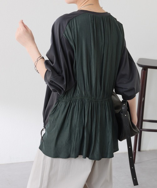 普通過ぎない、1枚で着映えするドッキングカットソー 【POINT】 ・前はカットソー生地、後ろはツヤ感のあるブラウス生地をドッキングしたデザイントップス。 ・後ろの腰周りにはギャザーが入っており、気になる身体のラインを拾わないのも嬉しいポイント。 ・ゆったりめのシルエットですが、後ろは落ち感のある生地ですっきり見えが叶います◎ ・裾にはドロストのコードがついており、シルエットを変えて楽しめます。 【おすすめコーディネート】 ゆったりめのシルエットなのでワイドパンツやタイトスカートとバランスが良いです。 合わせるカーディガンやジャケットによってドロストコードを絞って長さを調節できます◎ 【おすすめのスタイリングアイテム】 ・フラワージャガードスカート CLZ1061201A0003 【素材】 本体:綿100% 別布:ポリエステル59%, レーヨン41% 透け感:ホワイトのみあり 裏地:なし 伸縮性:カットソー部分のみあり 光沢感:なし おすすめ着用時期:春、秋 洗濯:手洗い可 ≪返品・交換について≫ ・着用後、洗濯後の返品・交換は致しかねます。 ・商品到着後、着用前に商品状態のご確認をお願い致します。 ・ECサイトでご購入いただいた商品は、お修理を承っておりません。 【気になる商品は「お気に入り」登録を】 ハートマークをクリックし、お好きなカラーを選んでお気に入りに登録すると 入荷情報や残り1点の通知、完売カラーの再入荷、セール情報などを受け取ることができます。 ※撮影場所やお使いのモニター環境により若干お色味が異なる場合がございます。 特にロケの撮影では明るく見える傾向にございます。詳細撮影画像で色味をお確かめくださいます様お願いいたします。 ※サンプルで撮影をしております。若干の仕様が変更になる場合がございますので予めご了承の上ご注文くださいますようお願いいたします。 ※サンプルでの採寸のためあくまで目安となります。予めご了承ください。