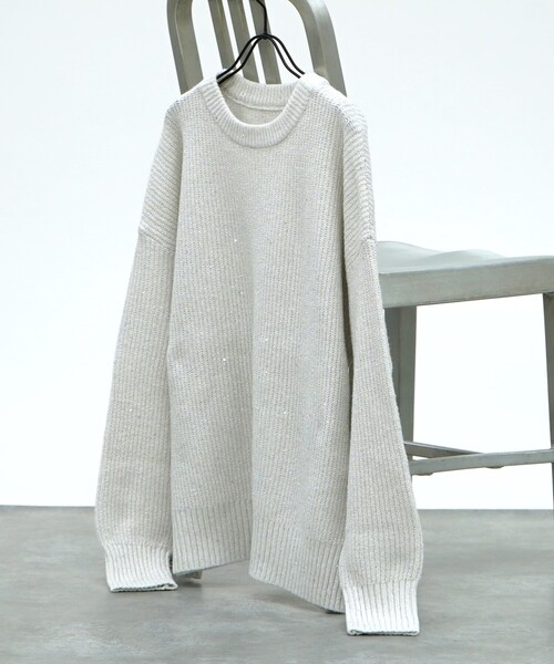 【Design】ラメとスパンコールが軽やかな印象にしてくれる春カラーニット。程よい厚みで冬の間から春先まで長く着ていただけます。単品ではもちろん、シャツやタートルと重ねたり幅広いコーデに活躍。ゆったりサイズで合わせるボトムも選ばないので、重くなりがちな冬コーデをパッと華やかにしてくれます。【Fabric】少しザックリな編地で柔らかく気軽に着やすい化繊のニット。スパンコールは派手過ぎず、メンズライクなデザインに対してさりげない女性らしさを演出してくれるのが魅力。【Styling】キレイ目パンツにフロントインで通勤などにも◎シャツイン+スカートなどトラッドなコーデに仕上げるのも今の気分です。