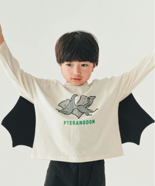 プテラノドンになりきれるロングTシャツ フロントのプリントも可愛いですがなんといっても後ろ姿の大きな羽がポイントです。 80/90/95cmは脱ぎ着しやすいよう、肩にスナップボタンがついています。 100cmからはスナップボタンがついていない仕様になります。 nico hrat ニコフラート フラートとはチェコ語で「遊ぶ」という意味です。 いつもニコニコ元気に遊ぶ子供たちに着てほしい、 そんな思いをこめて服づくりをしています。 着心地のよさはもちろん、素材や風合いを大切にし 毎シーズン遊ぶのが楽しくなるようなデザインを展開していきます。