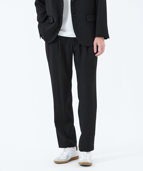 高級感と抜け感を併せ持つ2タックパンツ【デザイン】ゆったりしたシルエットの2タックパンツ。ヒップと渡りはゆとりを持たせ、テーパード(裾に向かって細くなっていく)シルエットのため、程よい抜け感がありながらも、スッキリした印象です。ウエストは後ろゴム仕様なので、ベルトなしでも穿けるリラックスした穿き心地です。【素材】ふくらみのあるポリエステルの二重織ツイル素材。適度な肉感があり、ドライタッチで肌離れも良いのが特徴。2WAYストレッチでしわになりにくく機能性にも優れています。【機能性】ウォッシャブル・しわになりにい*同素材のジャケット(品番:H1E87615)、カーディガン(品番:H1F74615)の展開もございますので、さまざまなコーディネートをお楽しみいただけます。ビジネスマンが出張を快適に過ごすためのアイテムである「トロッター」シリーズ。マッキントッシュ フィロソフィーならではのファンクションへのアプローチを本格志向のものづくりに融合させたコレクションです。【おすすめ着用ウエスト】38サイズ:ウエスト78cm前後の方40サイズ:ウエスト82cm前後の方42サイズ:ウエスト86cm前後の方おすすめ着用期間:秋/冬※サイズについては、仕様書のサイズを記載しており、多少の誤差が出る場合がございます。※この商品はサンプルでの撮影を行っています。実際の商品とイメージ、仕様が異なる場合がございます。