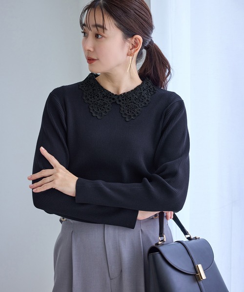 甘さ控えめ、レース衿で品よく華やぐリブニット【素材感】 ・レーヨン1にストレッチ糸をプレーティングし、安心感のある肉感に仕上げたニット。 ・リブ編み仕様で、すっきりとシャープな印象。 【デザイン・シルエット】 ・別素材のレース衿をあしらった、1枚で存在感のあるデザイン。 ・甘さを抑えた上品なレース使いで、大人フェミニンな印象に。 ・リブながらタイトすぎないサイズ感で、きちんと感とリラックス感を両立。 【カラー】 ・ベーシックで幅広いスタイリングに対応する3色展開 ※ライトグレー(08):ホワイトレース ※オフホワイト(15):ホワイトレース ※ネイビー(40):ブラックレース 【スタイリングポイント】 ・ジャケットのインナーとして、衿元を華やかに見せる着こなしがおすすめ。 ・一枚着で、きれいめパンツやボリュームスカートを合わせた上品スタイルにも◎ ----------------------------- 裏地:なし 光沢感:なし 透け感:なし 伸縮性:あり ボタン:後にあり(開閉可) 生地の厚さ:普通 季節:春、秋、冬 ----------------------------- ※撮影時の光、お使いのモニター環境によって色の見え方が違う場合がございます。 【モデル着用サイズ】 ライトグレー(08)着用 身長:166cm 着用サイズ:M その他カラー着用 身長:165cm 着用サイズ:M 【2026 Spring】【26SS】