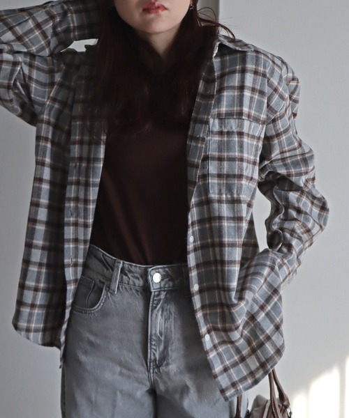 腰巻使いにもかなりおすすめな汎用性抜群のチェック柄ネルシャツ -detail- お尻まで隠れる少し長めな着丈のルーズシルエット。 レギュラーカラーのシンプルデザインで、腰巻などのアクセサリー的な用途としても使い勝手抜群です。 適度に広めな身幅とドロップショルダーで羽織としての着こなしも◎ -fabric- 表面を起毛加工した適度な厚みのネルチェック素材。 -styling- スウェットパンツやデニムパンツなどでカジュアルコーデはもちろん、 スラックスで大人っぽい雰囲気や、ショート丈のインナー合わせもおすすめです。 ニット帽やキャップ、サングラスや眼鏡などを組み合わせることでコーディネートに雰囲気がでます。 レディースモデル身長:162cm