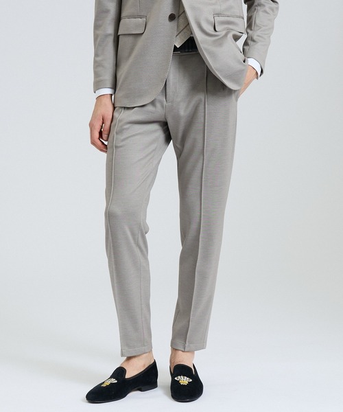 軽快な穿き心地の上質イージーパンツ【素材】イタリア DRAGO 社の高級糸を使用した上質ジャージー素材。セットアップに最適なストレッチ性と、伸縮後の形状回復性を備えています。高温・高圧の蒸気で毛羽を抑え、光沢・ハリ・コシ、しなやかさを与える加工を施し、織物のようにスマートで上品な表情に仕上げています。【デザイン】フロントセンターにピンタックを入れた、ブランド定番のイージーパンツ。程よく細身のシルエットながらストレスのない穿き心地で、オン・オフ問わず活躍。同素材ジャケット(品番:03520082000)とのセットアップスタイルに対応しています。【コーディネート】ジャケットとのセットアップはもちろん、ニットやシャツ、カーディガンとも好相性。きれいめのスタイリングからビジカジ、ドレス寄りまで幅広く対応します。上品な素材感により、シンプルなトップス合わせでも洗練された印象に。セットアップ対応品ジャケット:03520082000シャツ:03520010000ワイドテーパードパンツ:03520059004