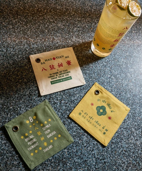 Ba Hao Tian Mi - (バー・ハオ・ティアン・ミー) - meets niko and ...タイの大人気プリン屋さんとの初コラボレーション色によってデザインが異なる、3色セットのコースター。それぞれに〈Ba Hao Tian Mi〉らしいモチーフをあしらい、ドリンク時間のアクセントにぴったり。布製で扱いやすく、気軽に取り入れられるアイテムです。カラビナ付きで、3つまとめて収納でき、アウトドアシーンにも◎【Ba Hao Tian Mi - (バー・ハオ・ティアン・ミー)-】「バー・ハオ・ティアン・ミー」は、バンコクの中華街ヤワラートに本店を構え、現在市内6店舗を展開するプリン屋さん。豊富に取り揃えたメニューの中でも、甘さ控えめの豆乳プリンにクコの実のシロップがかかったシンプルな豆乳プリンが人気のお店。※サンプルにて撮影をしておりますので、実際の商品とは仕様や加工・サイズ等が若干異なる場合がございます。※屋外の光や照明の当たり具合で、実物と色味が異なって見える場合がございます。詳細画像の色味をご確認ください。 なお、商品の色や質感を出来るだけ忠実に再現するよう心掛けておりますが、パソコンなどの環境により、実物と若干異なる場合がございます。※写真を許可無くコピー・転用することは固くお断りします。