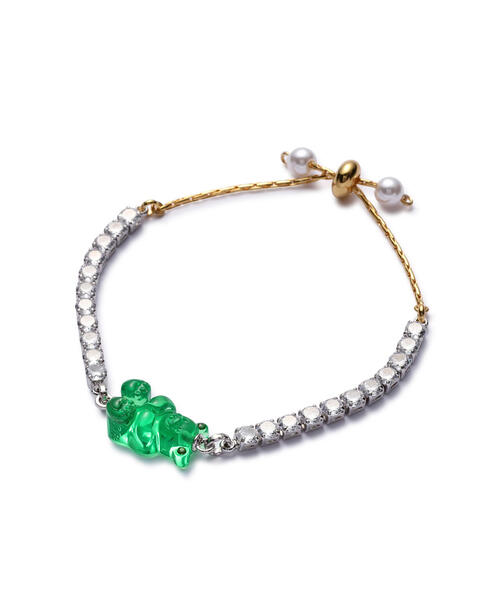 MIKSHIMAI エレガントな印象の強いテニスブレスレットを、ミクシマイならではのカラーで仕上げた一品。 スワロフスキークリスタルを用いたチェーンにアイコニックなキャンディベアのチャームを添えています。 着用しやすいスライド式のディティールも魅力的です。 MIKSHIMAI ミクシマイは韓国発のカスタムジュエリーブランド。日本に留学した経験を持つキム・セアムとキム・ダソル姉妹が、2013年に韓国を拠点に始動。ブランド名は2人の苗字である「キム(KIM)」に、日本語の「姉妹(SHIMAI)」から作られた造語で、独学でジュエリー製作を開始すると、多くのK-POPアイドルたちが愛用する人気ジュエリーブランドへと成長。カラフルなグミベアやビジューを基調に、様々な異素材を組み合わせたデザインが特徴。 BTS(防弾少年団)やBLACKPINK、NCT、TWICEといった数多くのK-POPアイドルの衣装で使用されたことで話題を集めたが、デザイナーが多忙のため一時展開を制限。 2023年12月にブランド設立10周年を迎え再始動。同時にLHPで取り扱いをスタートし日本再上陸を果たした。