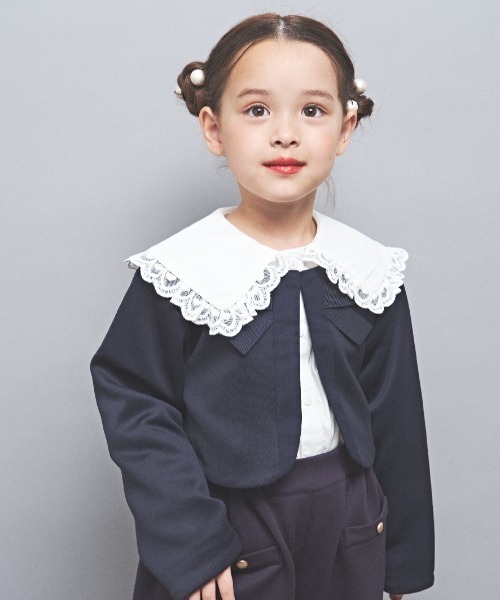 [140-160]もあります エレガントで上品なデザインのジャケットタイプのボレロです。フロントにあしらわれたリボンがアクセントとなっています。素材には柔らかな風合いのダンボールニットを使用しており、着心地の良さと保温性を兼ね備えています。シンプルながら洗練された印象で、フォーマルなシーンにもぴったりの一着です。同じ生地のキュロットパンツとセットアップでの着用もおすすめですし、フォーマルなワンピースの羽織りものとしてもお使いいただけます。105-5205031ダンボールニットリボンボレロ110-5205037ダンボールニットフリルキュロット ● maarook (マルーク) 2009 A/Wよりスタートしたベビー + キッズ + おとな服 size: 70 ~ 150cm F(160cm) かわいいだけじゃない、 シンプルなだけでもない クールだけどちょうどいいバランスの服をつくっています