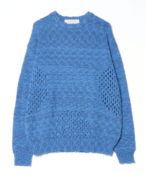 スラブコットンとナイロンアクリルウールのローゲージのクルーネックセーター。部分的にメッシュの編み方と大きさを変えてベンチレーション仕様に。リブとヘムはリブ編み。軽量でふんわりしたリラックスシルエット。