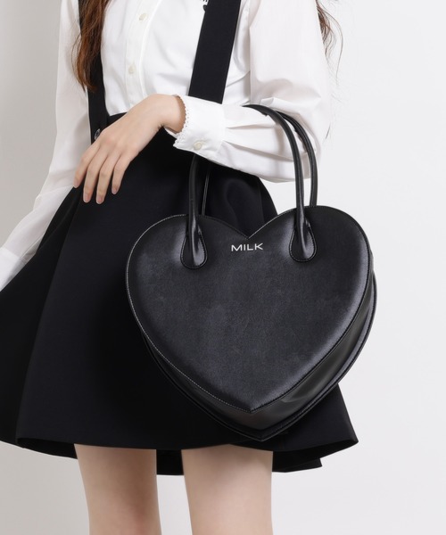 MILK 2026 Spring・ブランドの定番として愛され続けるハート型バッグ・立体的なフォルムでマチがしっかりと確保されており、見た目以上の収納力。お財布やポーチなど、日常の必需品をスマートに持ち歩けるデイリー使いに安心の容量です♪・甘さを引き立てるピンクと、コーディネートをシックに引き締めるブラックの2色展開。上品な質感で、カジュアルからガーリーなコーデまで幅広くマッチします◎♡ Colors ♡A,ピンクB,ブラック♡ Size ♡W 34㎝ / H 31㎝ / D 12㎝♡ Material ♡合成皮革