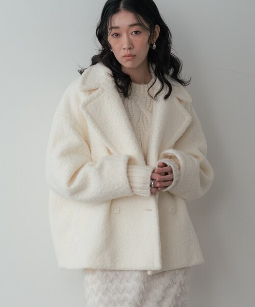 Design Point ダブルブレストのショートコート。 大きめラペルとボクシーな身幅で今っぽいバランスに。 空気を含むブークレ調の表面感がリッチで、大きめのボタンとシームポケットで端正な佇まいです。 Styling Point ざっくりタートルや薄手ニットに重ねて、前を留めてもラフに開けてもサマになるアイテム。 センタープレスのスラックスはもちろん、プリーツやIラインスカート、ワンピースの羽織りとしても好相性。 Fabric Point 軽量であたたかい起毛タッチの素材感。 表面のループが空気を抱き込み暖かく、ふっくらとした肉感で体のラインを拾いにくいのが特徴です。 デイリーに頼れる適度なハリと柔らかさを兼ね備えたコート素材です。 ※照明の関係により、実際よりも色味が違って見える場合があります。また、パソコン・スマートフォンなどの環境により、若干製品と画像のカラーが異なる場合もございます。 店舗へのお問い合わせ商品番号:523-94015 ●製品寸法: 38(M):着丈65cm B126cm 袖丈51cm 裄丈82cm 肩幅59cm 備考: