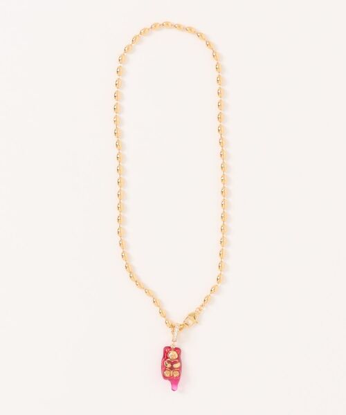 MIKSHIMAIポップで遊び心のあるベアモチーフを、MIKSHIMAIらしい感性で昇華したネックレス。溶け出すような立体的フォルムが印象的で、シンプルながらも確かな存在感を放ちます。ゴールドカラーのチェーンは程よいボリューム感があり、トップとのバランスも良好。Tシャツやスウェットなどのカジュアルスタイルはもちろん、あえてミニマルなコーデに合わせてアクセントとして使うのもおすすめ。スタイリングにユーモアと個性をプラスしてくれるアイテムです。MIKSHIMAIミクシマイは韓国発のカスタムジュエリーブランド。日本に留学した経験を持つキム・セアムとキム・ダソル姉妹が、2013年に韓国を拠点に始動。ブランド名は2人の苗字である「キム(KIM)」に、日本語の「姉妹(SHIMAI)」から作られた造語で、独学でジュエリー製作を開始すると、多くのK-POPアイドルたちが愛用する人気ジュエリーブランドへと成長。カラフルなグミベアやビジューを基調に、様々な異素材を組み合わせたデザインが特徴。BTS(防弾少年団)やBLACKPINK、NCT、TWICEといった数多くのK-POPアイドルの衣装で使用されたことで話題を集めたが、デザイナーが多忙のため一時展開を制限。2023年12月にブランド設立10周年を迎え再始動。同時にLHPで取り扱いをスタートし日本再上陸を果たした。