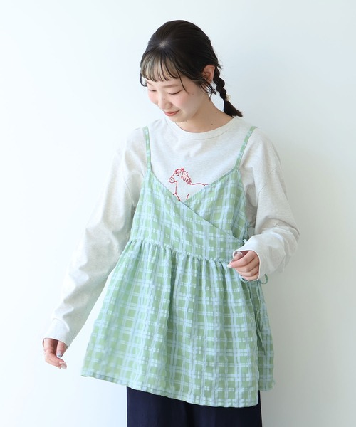 軽やかな透け感とぽこぽことした表面感がかわいいsheer check。ビュルデサボンがいつもお願いしている、一宮の機屋さんで織っていただきました。フロントはカシュクール仕様、サイドのリボンで結ぶデザインにすることで、甘さの中にほどよい抜け感をプラス。肩紐は華奢に仕上げ、インナーとのレイヤードが楽しめるバランスにこだわりました。カットソーやブラウスに重ねるだけで、いつものコーディネートが新鮮な印象に。同素材のボトムと合わせたセットアップ風の着こなしもおすすめです。季節に合わせてインナーを変えながら、長く楽しめる一枚。bulle de savonらしい、着るたびに気分がやわらぐキャミブラウスです。============================透け感:あり伸縮性:なし光沢感:なし============================※素材の特性、お取り扱いの注意水洗い可・・・中性洗剤使用アイロン可・・・あて布使用・デリケートな素材ですので、激しい運動や極度な力が加われば、目が開いたり目寄れ(織糸が滑り、目が開く)する性質をもっています。bulle de savon(ビュルデサボン)BRAND CONCEPT女性、誰もが ふっと子供の頃を思い出し 少女のような気持ちに戻れる服。 bulle de savon =シャボン玉の事 石鹸の泡とか、においなど、 懐かしい感じ。設立年月日 1994年8月※グリーンはサンプルです。実際の商品と仕様・加工・サイズ等が若干異なる場合がございます。※モデルの着用画像は光の関係で商品の色味が若干異なります。※取り扱いの注意については取り扱い表示をよくご確認の上、着用をお願いいたします。※工場の生産の都合上、入荷の時期が前後する場合がございます。ご了承ください。