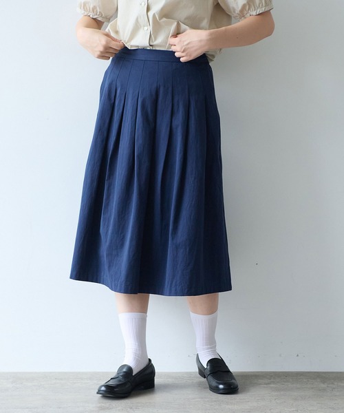 あたたかい季節に向けて、デニムよりもっと軽やかな高密度ツイルでスカートを作りました。サンドウォッシュ加工を施しているため、高密度ツイルのつやっとした表面感は残しつつ、くたっとほどよいやわらかさに仕上がっています。しっかりとした高密度なツイル生地を使い、 タックを寄せてふっくらと仕上げたタックスカート。今年は短め丈のスカートが気になっていて、思いきって膝下丈のものをつくってみました。どこか独特のヴィンテージのようなこなれた風合いは、シンプルなシャツやカットソーを合わせるだけでどこか深みのあるコーディネートに見せてくれます。============================透け感:なし裏地:なし伸縮性:なし光沢感:なし============================※素材の特性、お取り扱いの注意水洗い可・・・中性洗剤使用アイロン可・・・あて布使用・濃色の場合、湿った状態での摩擦や長時間放置しますと他の物に色移りする事がありますのでご注意下さい。bulle de savon(ビュルデサボン)BRAND CONCEPT女性、誰もが ふっと子供の頃を思い出し 少女のような気持ちに戻れる服。 bulle de savon =シャボン玉の事 石鹸の泡とか、においなど、 懐かしい感じ。設立年月日 1994年8月※ネイビーはサンプルです。実際の商品と仕様・加工・サイズ等が若干異なる場合がございます。※モデルの着用画像は光の関係で商品の色味が若干異なります。※取り扱いの注意については取り扱い表示をよくご確認の上、着用をお願いいたします。※工場の生産の都合上、入荷の時期が前後する場合がございます。ご了承ください。
