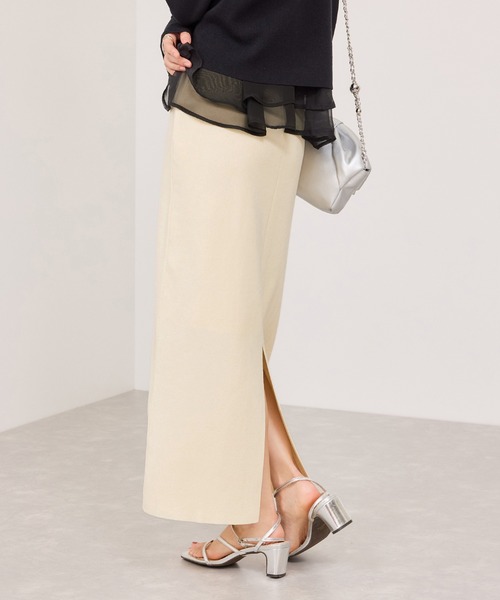 【2026 Spring】【26SS】【デザイン・シルエット】フロントのピンタックがスタイルを細見えするデザインで、すっきりとしたIラインシルエットのスカートです。バック裾にはスリットを入れており、女らしい抜け感もあり、歩きやすさも考慮して仕上げています。【素材】手洗い可能。ソフトな風合いのストレッチ性のある編地です。【カラー】ベーシックで着易いオフホワイトと上品さもあるネイビーの2色展開です。【おすすめのスタイリング】ロンTやブラウス×ジャケットのボトムとして、カジュアルにもキレイ目にもなるのスタイリングです。ネイビーカラーは、美easyコンフォートジャケット(品番:BVV36010)のネイビーと合わせて、セットアップ風にもなる優れもの!-----------------------------裏地:なし光沢感:なし透け感:オフホワイト(15):ややあり伸縮性:ありウエスト:ゴムポケット:なしボタン:なし生地の厚さ:普通季節:春、秋-----------------------------【モデル着用サイズ】身長:160cm 着用サイズ:F※画像の商品はサンプルです。 実際の商品と仕様、加工、サイズが若干異なる場合がございます。※画像によっては実際の色味と異なる場合があります。正しい色味は生地アップ画像をご確認ください。