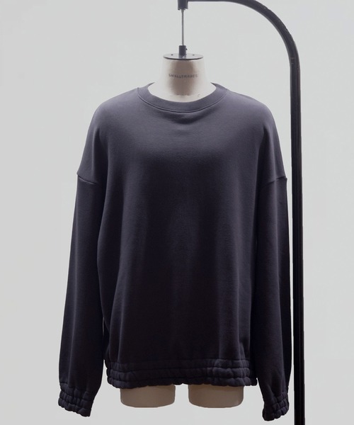 ベーシックなフィットのクルーネックスウェットシャツ。 袖口と裾に3本ゴムを強めに入れているので、ウエスト位置に留めてショート丈としても、そのままロング丈のままでも着て頂けます。 工場で廃棄予定の生地から厳選した、裏起毛された裏毛を使用しています。