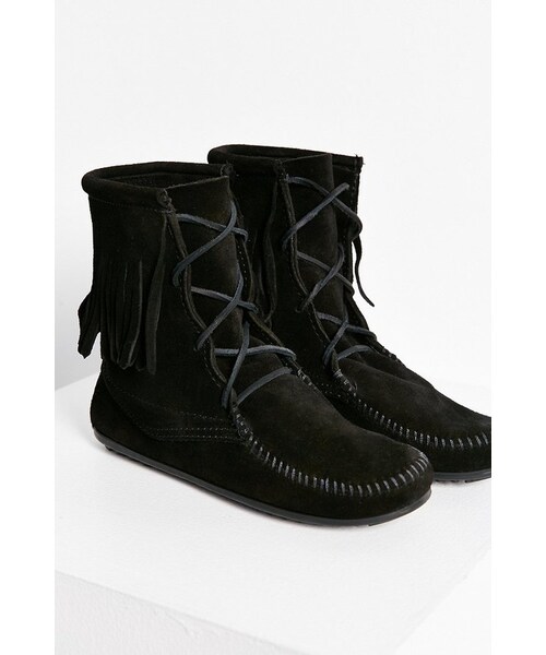 Classic fringetrimmed high top moccasin boots from American mainstay, Minnetonka. Composed of rich suede with leather rawhide laces that adjust up the full length of the shoe for a totally custom fit. Finished with thick rubber outsoles for venturing off the beaten path. Suede, rubber Spot clean Imported Size Shaft Height: 6.5" Shipping Only available for delivery within the United States