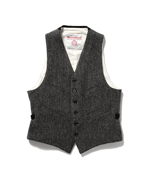 定番のベストが登場です。 フェザーウェイトと呼ばれる軽量ツイードで アメリカントラディショナルでは、オーセンティックな生地として取扱いされている、フェザーウェイトと呼ばれる軽量ツイードを使用しました。 着込む程に生地の風合いが増す、天然素材の代表格です。 型は、 60年代初頭のテイラーリングベストのシルエットを再現しました。 なんの変哲も無いベストですが、ハリスツイード独自の素材の風合いが最大の特徴です。 ジッパー付の多目的ポケットは、左右で ジッパーの向きを変えて配置しました。パスポートポケットや携帯電話用の ポケットとしてお使いいただけます。よりシンプルですが少しだけ機能を 加え仕上げました。バックストラップとネック部分のコーデュロイは、シンプルな素材の風合い を生かすアクセントとして取り入れました。