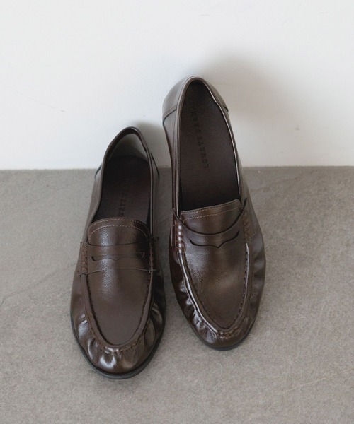 ■デザイン■モカ部分のシャーリングが特徴のコインローファーです。つま先、踵に芯が入っていないため、下ろした時から足なじみが良いです。つま先の裏に消臭抗菌テープが入っています。