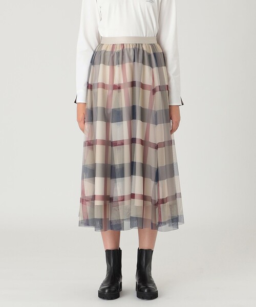 ◆クレストブリッジチェックチュールのふんわりスカート チュールをたっぷり使ったエアリーなシルエットのスカートです。 ウエストはゴム仕様で着心地快適です。 シーズンレス、シーンレスに活躍するアイテムです。