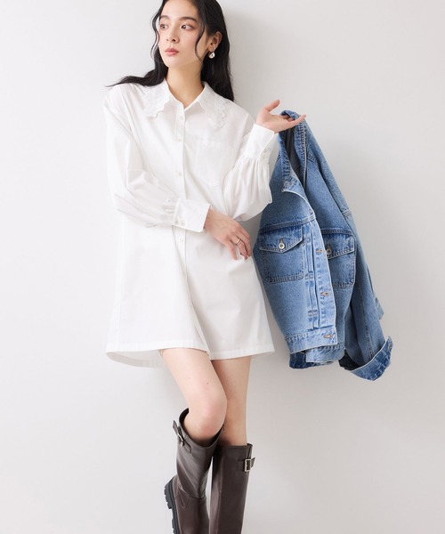 着るだけで華やかになる衿レースシャツワンピース!【2026 Spring】【26SS】 【デザイン・シルエット】 ホワイトカラーのケミカルレース衿が顔の印象を明るくしてくれるシャツワンピースです。 フロントのポケットがアクセントにもなり、背ヨークにはギャザーが入っていて、程良くゆったりとしたシルエットのシャツワンピースです。 【素材】 しなやかなコットンポリエステルブロード素材を使用しています。 衿はポリエステルケミカルレースを使用。 【カラー】 オフホワイト好きにはたまらない、レース衿も身頃もオフホワイトカラーと、シャツで人気カラーのサックスブルーの2色展開です。 【おすすめのスタイリング】 ミニ丈のFサイズ展開なので、身長の高い方には、ボトムにショートパンツを合わせて頂く事をおすすめします。 カバーオールと合わせたり、コンフォートツイルと合わせたり、羽織アイテムとのコーディネートがベスト◎! ----------------------------- 裏地:なし 光沢感:なし 透け感:ややあり 伸縮性:なし ポケット:あり ボタン:あり(開閉可) 生地の厚さ:普通 その他仕様:襟元はレース仕様。 季節:春、秋 ----------------------------- 【モデル着用サイズ】 身長:168cm 着用サイズ:F ※画像の商品はサンプルです。実際の商品と仕様、加工、サイズが若干異なる場合がございます。 ※画像によっては実際の色味と異なる場合があります。正しい色味は生地アップ画像をご確認ください。
