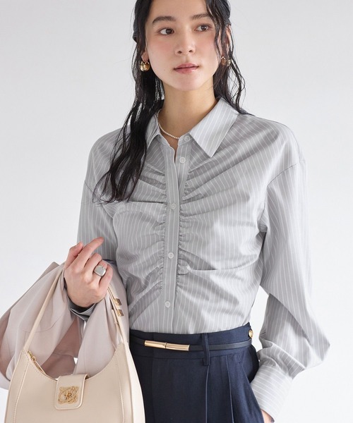 【2026 Spring】【26SS】<POINT>・フロントにギャザーデザイン・ウエストを少し絞っているスタイルアップ構造・コンパクトな着丈感【デザイン・シルエット】昨今ずっとトレンドのシャツアイテムは羽織ではなくトップス使いが増えてきました。春物を買いたい季節に重ね着もアウターのインナーとしても華やぐようフロントにギャザーデザインをほどこしたことと、オーバー過ぎないコンパクト目のサイズ感にしたことで万能使いできるようにしました。ウエストを細く見えるようなシャープなフォルムにしているのもポイントです!オケージョン使いも新生活にもぴったりです。【素材】透け感はなく、程よいハリ感と柔らかさのあるシャツ素材。合繊なのでシワになりにくいです。【カラー】オフホワイト、ライトピンク、ライトグレー、ブルーの4色展開。オフホワイト(15),ピンク系(65):無地ライトグレー(08),ブルー系(45):ストライプ柄【おすすめのスタイリング】インナーにリブニットやレースを重ねて、1枚でジャケットやアウターの中に着てもフロントでデザインがあるのでかわいいです!すっきりとしたサイズ感なのでボトムスは選びません!ワイドでもストレートでもハマります◎-----------------------------裏地:なし光沢感:なし透け感:ややあり伸縮性:なしボタン:あり(開閉可)生地の厚さ:普通季節:春、秋-----------------------------【モデル着用サイズ】身長:168cm 着用サイズ:F※画像の商品はサンプルです。実際の商品と仕様、加工、サイズが若干異なる場合がございます。※画像によっては実際の色味と異なる場合があります。正しい色味は生地アップ画像をご確認ください。
