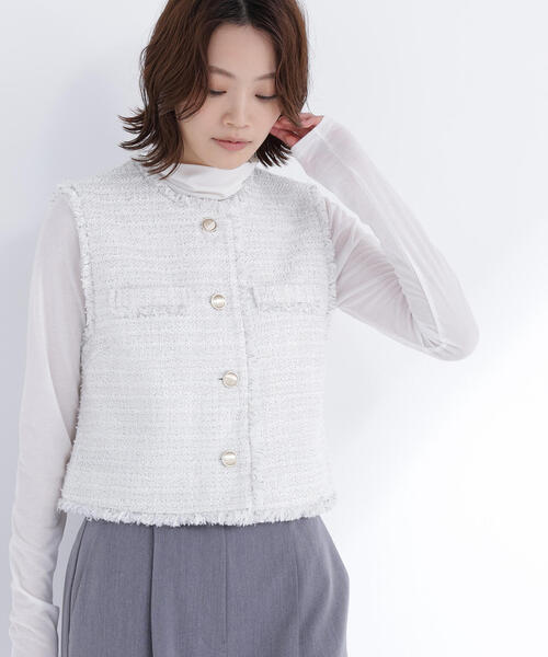 <お出かけ・オケージョンシーンにおすすめ> 程よくコンパクトなシルエットが上品さとスタイリッシュさを兼ね備えたツイードコンパクトジレ。ジャストサイズなのでレイヤードがしやすく、ブラウスやニットの上から羽織るだけで、日常からオケージョンまで幅広く活躍する万能アイテムです。フレアスカートやワイドパンツと合わせることで、メリハリのあるフェミニンコーディネートが完成します。 <素材> ほどよいカジュアル感のあるツイード生地を使用。 <詳細> 仕様・前ボタン 裏地・あり 透け感・なし / 光沢・なし / 伸縮性・なし 生地の厚さ・普通 <シリーズ> ■ジレ[品番:017-6155160] ※モデルの着用画像の場合、光の当たり具合により、実際の色味と異なって見えることがございます。色味は、商品単体の画像をご参照ください。 【ZOZOでのお買い物をもっと楽しむために!】 ■ブランド・ショップのお気に入り登録 ・いち早く新作アイテムや限定クーポンなどのお得な情報を受け取ることができます! ■商品のお気に入り登録 ・完売商品の再入荷通知や、残り1点の通知、各種セール通知も受け取ることができ、よりお得にお買い物頂けるチャンスがあります!