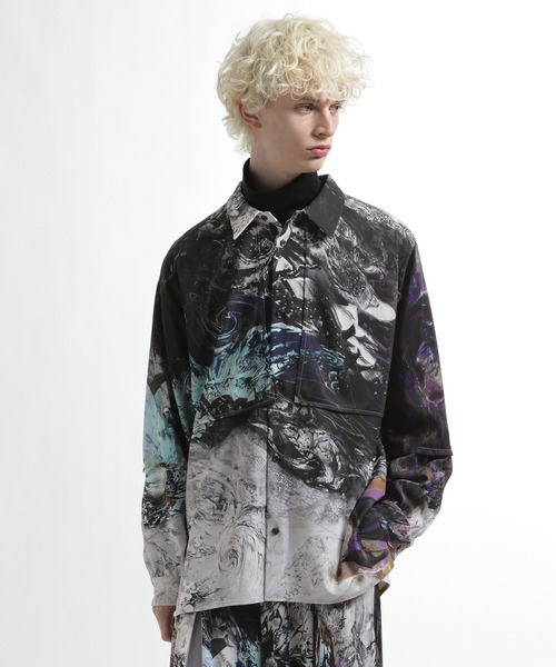 ーーー生地を重ねたレイヤードデザインの総柄シャツーーーDESIGN川﨑麻央氏の作品をプリントした柄生地にプリントした柄シアー生地を重ね、レイヤードしたデザインに。揺れるだけで立体感と奥行きが生まれます。オーバーサイズで一枚着でも羽織りでも着れる汎用性〇MATERIALポリエステル100%を使用。シワになりにくく、さらりとした肌触りで、シーズンレスに着用できる軽やかな素材感です。生地の落ち感が美しく、ゆったりとしたシルエットと相まって、リラックスしながらも上品な印象を与えます。artist川﨑麻央氏日本画家。主に神話や地元島根の神楽をテーマに描く。力強さや躍動感を感じさせる独特の筆致や色彩が特徴。1987年 島根県生まれ2017年 東京藝術大学大学院博士後期課程日本画修了 博士号 (美術) 取得2020年 第75回春の院展「国来、国来」春季展賞・郁夫賞 第11回春の足立美術館賞2022年 再興第107回院展「音楽室は根の国」大観賞・東京都知事賞2024年 第79回春の院展「鐘泥棒」外務大臣賞再興第109回院展「算」大観賞現在 東京藝術大学日本画テクニカルインストラクター 日本美術院 招待※ウィメンズ単独店への入荷はございません。