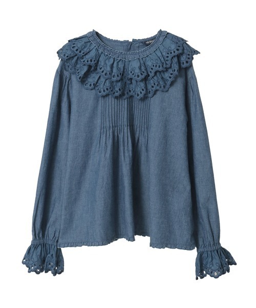 ざっくりとしたカットワークがナチュラルな雰囲気漂うコットンレースのスカラップフリルがデザインのポイントになるブラウス。首まわりに重ねてフリル襟のようにあしらって可愛らしく。袖まわりにもカフスのようにあしらって。身ごろにはこれから春にかけて長く着られるダンガリー地をセレクト。いつもの綿ローンやブロード地とは違う雰囲気をお楽しみください。ネップの極端に少ない糸で織り上げたダンガリー地は、粗野感がなく上品な仕上がりで、ごわごわ感もなく柔らかく着心地よく着られます。