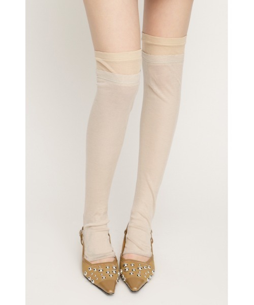 ■POINT/DETAILレイヤード風のデザインがこなれ感の出るシアーソックス。膝上でカラーを切り替え仕上げたニーハイ丈のソックスはプラスするだけで今季らしいスタイリングが完成します。断ち切り仕様なのでガーリーになり過ぎず、程良くグランジ感もプラスしてくれます。薄手で柔らかいシアー素材なので、シーズンレスで着用出来るのが嬉しいポイントです。■STYLINGミュールと一緒にミニボトムスと合わせたスタイリングが今季一押しです。膝上丈のニーハイソックスなので、ミドルブーツの中に仕込ませるのもおすすめ。■FABRIC/MATERIAL伸縮性のある薄手のフライス素材を使用しています。[注意事項]※画像の商品はサンプルです。実際の商品と仕様、加工が若干異なる場合があります。※画像の商品は光の照射や角度、お使いのモニター環境により、実物と色味が異なる場合がございます。※着用、お取り扱いの際は、アテンションタグをご確認ください。※一部予約商品につきましては生産上の都合によりお届け予定日や店頭発売と前後する場合もございます。※追加生産商品は、一部の店舗、通販で販売中の場合がございます。予めご了承下さい。【SLY/スライ】「Casual」「Girly」「Mode」をベースに発信する、ディテールへのこだわりが詰まった、どこか必ず女性らしさを感じるアーバンスタイル。 さまざまなエッセンスをミックスした、時代の空気を体現するコレクションを展開。▼商品のお気に入り登録お気に入りアイテムの値下げ・再入荷・在庫1点などの通知を受け取ることができます。▼ブランドのお気に入り登録新商品や再入荷、セール、クーポン配布などお得な情報を受け取ることができます。※こちらの商品はSLY独自の採寸方法となっています。本サイトのサイズガイドと採寸方法が異なる場合がありますのでご了承ください。