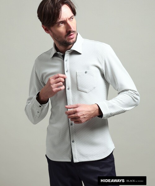 ■デザイン衿端にワイヤ-を仕込んだレギュラーカラーシャツになります。別生地にブラック×ホワイトのピンストライプのシャツ生地を使用し、尚且つバイヤス使いすることでアクセントになり、大人綺麗目に仕上げました。オリジナルの配色ボタンがちょっとしたアクセントになっています。■サイズほどよいリラックスフィットで着心地抜群。ウエストにやや絞りを入れたシャープなシルエットも魅力です。■素材ピッチ変化のあるタック編みの凹凸と質感の違う2種類のポリエステル糸でボーダーを表現しました。原着ブライト糸の光沢がアクセントとして効いています。合繊の為、軽くて張りがありスポーツウエアの様な快適な着用感が特徴。速乾性と防シワ性にも優れています。伸縮性:あり生地の厚さ:普通■注意点衿端に付属としてプラスティック線材を使用しています。局部的に繰り返し折り曲げたり、その部分にアイロンをあてないで下さい。【HIDEAWAYS BLACK】品質を重視し、シックで落ち着いた雰囲気の高級感のあるテイストを基本とし、より大人の男性も着回しやすいシンプルなビジネス対応も視野にいれたドレカジスタイルを提案。ネームも特別なブラックタグを使用し、より高級感を演出しています。※画像の商品はサンプルです。 実際の商品とは仕様・加工・サイズ・素材が若干異なる場合がございます。※掲載画像の商品の色味は、撮影場所や光の当たり具合などにより色味が異なって見える場合がございます。 商品の色味は、生地アップの画像をご参照ください。 また、お客様のお使いのPC・スマートフォン等のモニター環境などにより色味が異なって見える場合がございます。 予めご了承の上ご注文ください。※着用モデル身長182cm B89cm W75cm H90cm 着用サイズ48