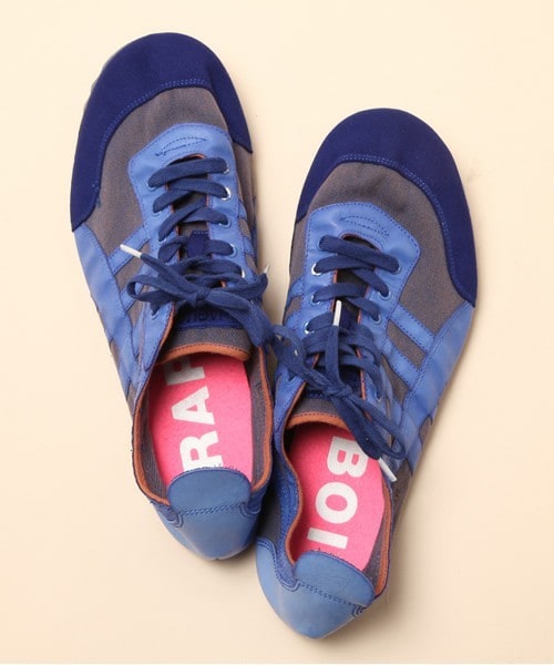 人気のジャガダイダイ! FRAPBOISの定番スニーカーです。 ムーンスターのスニーカー「ジャガー」を、製品になってから二回染めました。染めているので、独特の縮みが特徴です。大体2cmくらい縮んでいます。 例)シューズ自体の表記が25cmの場合、実際の履き寸は23cmです。 靴紐を通す金具部分が剥がれておりますが、こちらは商品の仕様になります。 予めご了承くださいませ。