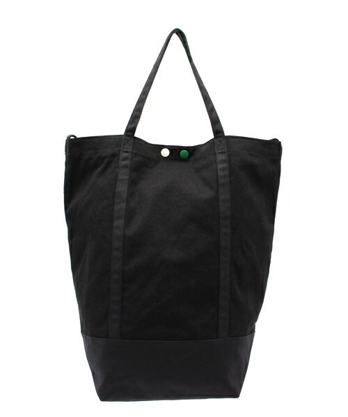 FRAPBOIS 2015-16 AUTUMN/WINTER COLLECTION 持ち手の細い綿キャンバスのショルダーベルト付きトートバッグ。 脇に挟んだリボンとバッグの小さな配色ドット釦がポイントです。 裏地には星柄の素材を使用しています。