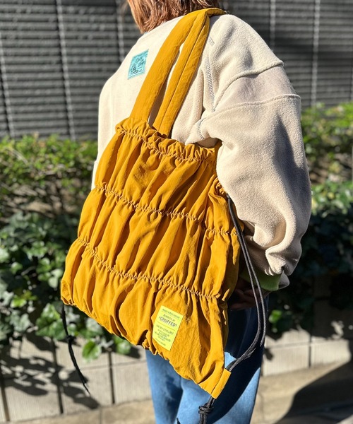 【2way:トート/ナップサック】シャーリングギャザーとPUFFERハンドルがカワイイBagこだわり満載のナイロンバッグです。ポイントになるオリジナルロゴの織りネーム付き。ナイロン素材にシャーリングデザインで、トートバッグとして◎口を絞って巾着のようにも。ゆったり長さのあるハンドルで、ビッグシルエットの洋服にも使いやすい!紐下の結びで長さ調整もできるナップサックとしても◎PUFFERハンドルは、そのままたらしても、内側に入れても、結んでも!両手がふさがってしまった時にも◎A4サイズ収納可能な大きさです。内側に便利なポケットあり◎ ←ポケットのカンドメステッチ、ロゴネームと同系色!オールシーズン、デイリーに使える万能バッグです。マスタードと、カーキは裏地が配色。(ブラックは裏地もブラック)ブラック×裏地ブラック+蛍光レッド(ピンク)ネームマスタード×裏地ブラウン+蛍光ライムネームカーキ×ブルー+裏地ブラック+ブラックネーム3色展開です。【Information】◆《お気に入り登録》がオススメ◆・「商品のお気に入り登録」で再入荷通知や、ラストの通知、セール通知も受け取ることが出来ます。・「ブランドのお気に入り登録」で新商品や再入荷など、お得な情報を受け取ることが出来ます。※撮影時のライティング、ご覧になっているモニター・PC環境により、実際の商品と色味が異なって見える場合がございます。予めご了承をお願い致します。※他のキャンペーンにより、期間中に価格が変動する場合があります。※セールは予告なく終了させていただく場合もあります。※ご注文いただいた予約商品のお届け時期の確認は、注文履歴ページより行えます。