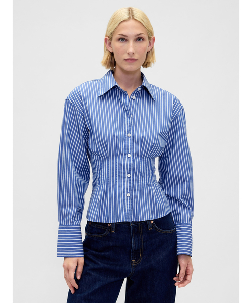 滑らかな質感のコットンポプリン生地で作られたボタンダウンシャツ、からだのラインに自然にフィットする細身シルエット、ややショート丈スプレッドカラー長袖、ドロップショルダー、袖口ボタンフロントボタンウエストにダーツ入り全体にストライプ柄が入ったものなどバリエーションあり合成農薬や肥料を使わずに栽培されたオーガニックコットンを100%使用しています。この商品は、RISE (Reimagining Industry to Support Equality) を通じてジェンダー平等と女性のエンパワーメントを精力的に推進する工場で生産されています。-*商品タグに記載の価格とサイト上の販売価格が異なる事があります。【Gap ギャップ】1969年にアメリカ・サンフランシスコで創業以来、世界的なカジュアルファッションブランドとして、常にモダンなアメリカンカジュアルを提案し続けています。※商品画像は、光の当たり具合やパソコンなどの閲覧環境により、実際の色味と異なって見える場合がございます。予めご了承ください。