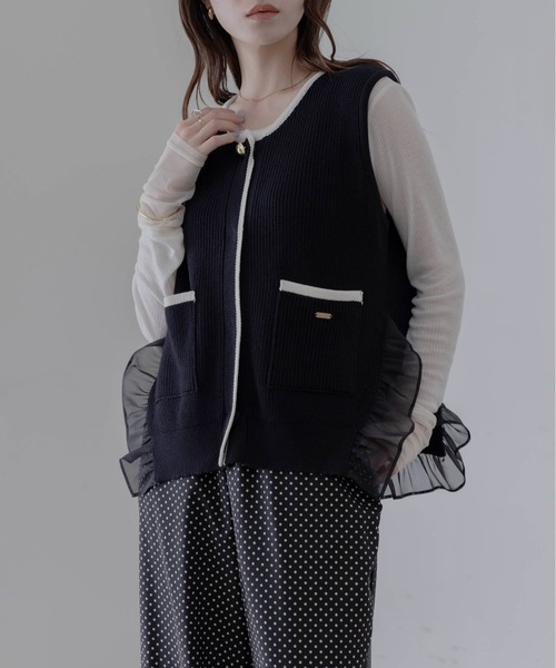 Pre-Spring Collection人気のシリーズSSバージョンが登場!サイドフリルが女性らしくも上品で毎シリーズ人気のベスト。レーヨンポリエステルのオリジナル糸でツヤ感がありながらも涼しく仕上げました。配色ラインでよりカジュアルなコーディネートにも合わせやすくアップデートしています。季節:春〜初夏、秋裏地: なし伸縮性:あり厚み:中肉透け感:なしチクチク感:なし【スタッフ着用コメント】〈スタッフ名 : 〉UENO年齢: 30代 / 身長: 156cm / 体型:細身 / 普段サイズ:S〜M・サイズ感 :大きすぎずジャストサイズ。ロンTなどインしやすいゆとりのあるAHです。・素材感:さらっとしていて春にぴったり。ノースリでも合わせられそう。※画像の商品はサンプルです。実際の商品と仕様や加工、サイズが若干異なる場合がございます。※撮影場所やイメージにより、実際の商品と色味が若干異なる場合がございます。※サイズに若干の個体差が生じる場合がございます。予めご了承下さい。【オススメの機能について】《商品のお気に入り登録》により、完売カラーの再入荷通知、ラスト1点の通知、セールの通知も受け取ることができます!《ブランドのお気に入り登録》により、新商品や再入荷など、イチ早くブランドのお得なセールやクーポン配布などの情報を受け取ることができます!お得な情報をGETして頂く為にも、是非ご活用くださいませ