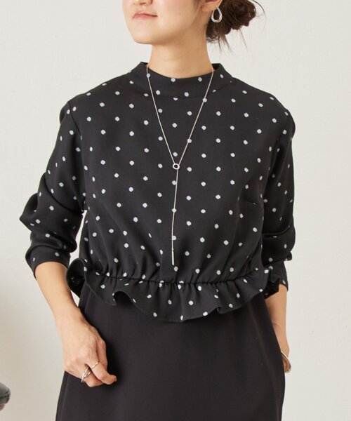 ■アイテムブラックベースのポリエステル×レーヨン素材に、ホワイトのドットプリントを施したブラウス。ドットはあえてゆらぎをもたせ、ラフなタッチにすることで、かしこまりすぎない抜け感をプラスしています。首まわりに若干ゆとりをもたせたハイネックがクラシックな印象で、顔まわりをすっきりと上品に演出。後ろ身頃にボタンを配置し、立体的なブラックのボタンがデザインポイント。裾にはさりげなくフリルをあしらい、甘さを抑えた中にも女性らしさを添えています。着丈はややコンパクトで、同素材のスカートと合わせたセットアップスタイルもおすすめです。※こちらは《LIVETART》のタグがつきます。■素材・洗濯表示素材:ポリエステル55% レーヨン45%洗濯表示:手洗い可※着用時・洗濯時は、必ず取扱い表示・タグをご確認の上、お取り扱い下さい。----------------------------------伸縮性:生地なし・袖口なし・裾あり光沢:なし厚み:ややうすい透け感:なし裏地:なしポケット:なしファスナー:なし(後ろボタン仕様)----------------------------------《LIVETRT/リヴェタート》BEARDSLEYのインブランドLIVETART(リヴェタート) 美しい刺繍やレース、しなやかなフォルム、鮮やかな色彩、大胆なプリント。アートに触れるような心地よい緊張感であらたまった場所へも気負いなく身につけられる。日常と非日常をつなぐ、いつもより少し高揚感に包まれる服。《お取り扱い上のご注意》・タンブル乾燥不可・洗濯は水洗い(手洗い)のうえ、他のものと分けて単独で洗ってください。・長時間水に漬けておいたり、濡れたまま放置せず、洗濯後は形を整えてからすばやく陰干ししてください。・この素材は摩擦(特に湿った状態での摩擦)や汗、雨などで濡れた時は他の衣料や下着に色が移る場合がありますのでご注意下さい。・この製品は、顔料プリントを使用しています。このプリントは、洗濯や着用時の摩擦などで、多少色褪せたり、ひび割れる場合があります。プリント部分のもみ洗いやアイロンがけは、お避けください。《予約商品について》・サンプルの為、素材情報、洗濯表示については企画段階の情報を記載しております。公的機関での試験データ結果を受け、量産にあたり混率や洗濯方法の変更が発生する場合がございますので、ご了承くださいませ。・サンプルでの撮影、計測をしております。商品の仕様が一部変更になる場合がございます。・撮影サンプル品はブランドタグがついておりません。製品にはタグがつきますので、製品の表に縫い糸が見える場合がございます。・工場の生産の都合上、納期が変更になる場合がございます。検品や輸送の関係で、発送日が前後しますのでご了承ください。また、入荷状況により、お客様への発送が店頭販売より遅れる場合もございます。・店頭に陳列していた商品も含まれる場合がございます。《商品画像について》ご覧頂いている商品の写真につきましては、できるだけ実物の色に近くなるように努めておりますが お使いの環境(モニター、ブラウザ等)の違いにより、色の見え方が実物と若干異なる場合がございます。 予めご了承ください。《ハートをタップして商品のお気に入り登録》【ハートをタップ】登録カラーの商品の「残りわずか」「再入荷」「値下げ」通知を受け取ることができます。【各ショップアプリにてブランドフォロー】 新商品などの入荷情報、最新のニュースやお得な情報を受け取ることができます。