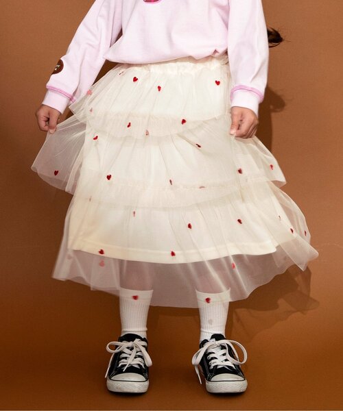 BREEZE:Heart Tone Collection\ ビターにきめる?あま~くとろける? /ふわっと揺れるチュールスカート♡ティアードデザインで、ふんわり感UP!小さなハート刺繍入りで、大人顔負けの1着に。>>CollectionJ106056【リンク】スウィートバリエーションTシャツJ132916 スウィートバリエーションカバーオールJ118016ハート総柄刺繍チュールスカートJ121026ハート総柄刺繍バレルパンツJ168046刺繍ロゴキャップJ154156スウィートバリエーションソックスJ121016【リンク】NEWシェフパンツ【取り扱い表示】40℃を上限に洗濯機で洗濯、デリケートアイテムモード、ネット使用、漂白剤禁止、色物は同系の色と一緒に、洗濯後直ちに取出し、タンブル乾燥不可、日陰で吊り干し、アイロン禁止、商業ドライクリーニング不可【ご注意事項】この商品は着用中の摩擦や洗濯により毛羽の乱れ、毛羽脱落、毛玉が生じることが有ります。できるだけ美しくご利用頂く為に次のことにご留意下さい。○毛玉は毛玉取り器またはハサミで丁寧にカットして下さい。○毛羽が他に付着した際はテープやブラシで除去して下さい。○他の製品とは洗わず、単独でお洗濯して下さい。○タンブル乾燥はお避け下さい。※商品により多少の誤差が生じる事がございます。あらかじめご了承下さい。※ご使用のパソコンやブラウザの環境により、実際の色とは多少異なる場合がございます。※モデル着用写真についてはイメージの為、実際の商品とカラーや仕様が異なる場合がございますので、商品画像をご覧ください。【 BREEZE -ブリーズ- 】WEAR A HAPPY SMILEこだわりと遊び心のつまった、着ると「笑顔」のWEAR、「着たい」がいっぱいのSHOPそんなHAPPY SMILEに出会える場所がBREEZE▼気になる商品をお気に入り登録ハートマークをクリックして『お気に入り登録』がオススメです!商品のお気に入り登録をすると、[再入荷][残り1点][セール情報]を受け取れます。また、『F.O.Online Store』を、お気に入り登録すると[新作アイテム][再入荷]の情報をいち早く受け取れます♪