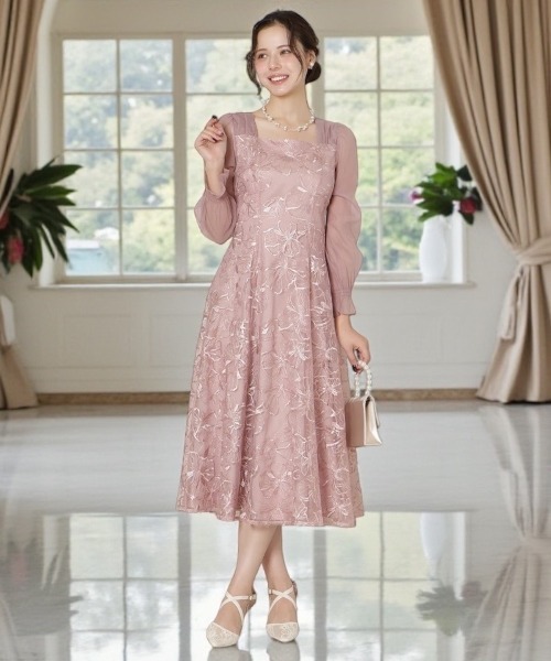 程よいシアー感とシルエットが好バランスのオケージョンドレス【Design】・フラワー刺繍が目を惹く、上品なワンピース。・程よいシアー感が上品見えさせてくれます。・バックレースアップ仕様によりフィット感の微調整も可能◎・結婚式や二次会などのパーティーシーンはもちろん、特別なお出かけにもぴったりの一着です。・後ろファスナー仕様。【Fabric】・透け感のあるフラワー刺繍生地を施した華やかなファブリック。・裏地付き。・ピンク、チャコールグレーの2色展開になります。【Care】・ドライクリーニングF:(00):着丈120cm/身幅47cm/肩幅34cm/袖丈59cm/袖幅37.4cm/袖口幅20cm/ウエスト72~80cm/裾回り300cm