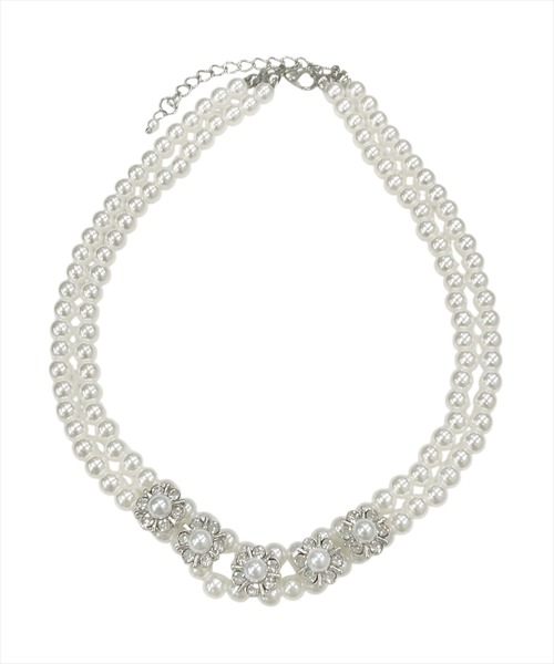フラワービジューが愛らしいパールネックレス 【Design】 ・上品ながらも普段使いしやすい小ぶりなサイズのパールを使ったネックレス。 ・ハイネックのトップスの上から付けたり、これからのシーズンで活躍してくれます♪ ・パールのツヤで存在感のある仕上がり。 ・アジャスター付きで、サイズの調整が可能です◎ F:長さ:32cm アジャスター:5cm トップ縦:1cm トップ横:1cm