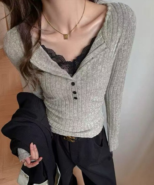 レースVネックで華やか見え!レースレイヤード風Vネックニットトップス【デザイン】レースをのぞかせたレイヤード風デザインが大人ガーリーなVネックニットトップスです。細リブ編みが縦ラインを強調して、すっきり細見えシルエットを叶えます◎デコルテを美しく見せる女性らしさもありつつ、程よいフィット感で上品な印象に仕上がります♪【素材感】着心地の軽いポリエステル素材伸縮性:あり/ 透け感: あり/ 裏地:なし 手洗いによる洗濯可 / ドライ・ウェットクリーニング可【コーディネート】台形ミニスカートやショートボトムと合わせると、韓国っぽくメリハリの効いたスタイリングに♪チェスターコートを羽織れば、こなれたムードがUPして冬まで活躍します◎シンプルボトムと合わせても華やかさが出るのでデイリー使いにもおすすめです。【※お取り扱い上のご注意】1:モニター環境等により実際の商品と多少色味が異なって表示される場合がございます。予めご了承下さい。2:屋外で撮影された商品は、天候により多少実際のカラーと異なる場合があります。商品のカラーはトルソー(マネキン)の商品画像をご参照ください。3:濃い色の商品は、お洗濯や摩擦等による移染にご注意ください。4:末永くご愛用頂く為に、アテンションタグ・洗濯ネームを必ずご確認の上、着用又はお取り扱い下さい。5:生産時期により、色、サイズ、デザイン、素材の質感が多少が異なる場合がございます。あらかじめ御了承下さいませ。