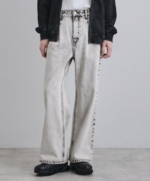 【素材】コットン100%で仕上げた、程よい肉感の11ozデニムを使用しています。ブラスト加工による自然なアタリ感に加え、インディゴカラーにはカラートッピングを施した後に洗い加工を行うことで、奥行きのある豊かな表情を生み出しました。穿き込むほどに体に馴染み、自分だけの色落ちを楽しめる、ブランドならではのこだわりが詰まったデニムです。【デザイン】独創的なディテールが光る、存在感のあるワイドストレートシルエットのデニムパンツ。フロントには、脇側に寄せたタックを施すことで、着用時にたっぷりとボリュームのある丸みを帯びた筒状の美しいシルエットが生まれます。ポケットは、デニムの定番である5ポケットではなく、スラックスのような斜めのスラッシュポケットを採用し、カジュアルな中にクリーンな印象をプラス。さらに、バックスタイルのアクセントとなるV字のベルトループなど、細部にまでこだわりを詰め込みました。シンプルなトップスを合わせるだけでスタイリングが完成するデザイン性の高い一本です。【仕様】・ポケット数:横×2 後ろ×2・前ファスナー・裏地なし【推奨サイズ】01サイズ(S):160~170cm02サイズ(M):165~175cm03サイズ(L):170~180cm※標準体型を基にした目安になります。- BRAND CONCEPT -時代を超えて支持されるトラディショナルなアイテムをベースに、アソビ心とストリートの自由な発想を取り入れ、日本独自のミックススタイルを提案します。【気になる商品はお気に入り登録をおススメ】▼商品のお気に入り登録完売しているカラーの再入荷通知や、ラスト1点、セールの通知をお知らせいたします。▼ブランドのお気に入り登録新商品や再入荷など、いち早くブランドの情報を受け取ることができます。※照明の関係により、実際よりも色味が違って見える場合があります。また、パソコン・スマートフォンなどの環境により、若干製品と画像のカラーが異なる場合もございます。モデル情報:身長183cm B81 W68 H86 着用サイズ:03(L)店舗へのお問い合わせ商品番号:170-75101●製品寸法:01(S):W76cm H100cm 股下70cm 前股上30cm 渡り幅30cm 裾幅28cm02(M):W80cm H104cm 股下71cm 前股上31cm 渡り幅32cm 裾幅28cm03(L):W84cm H108cm 股下73cm 前股上31cm 渡り幅33cm 裾幅29cm備考: